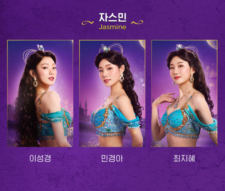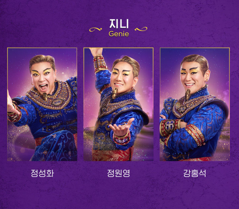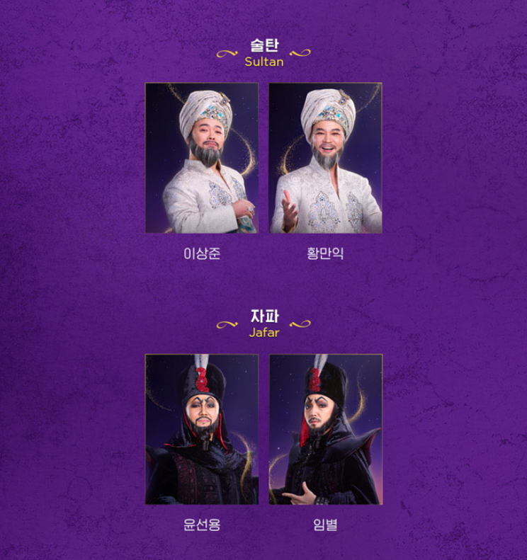 알라딘 역할로는 김준수, 서경수, 박강현 님이 맡았습니다. 지니 역할은 정성화, 정원영, 강홍석 님이 맡았습니다. 자스민 공주 역할에는 이성경, 민경아, 최지혜 님이 맡았습니다. 술탄 역할에는 이상준, 황만익 님이 맡았습니다. 자파 역할에는 임별, 윤선용 님이 맡았습니다.