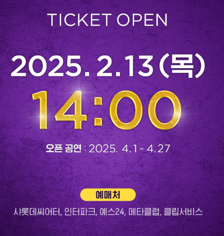 6차 선예매 샤롯데씨어터는 2025년 2월 12일 수요일 오전 11시에 진행이 되었습니다. MON멤버십 선예매 일정은 2025년 2월 12일 목요일 오전 12시에 진행이 이미 이루어졌습니다.