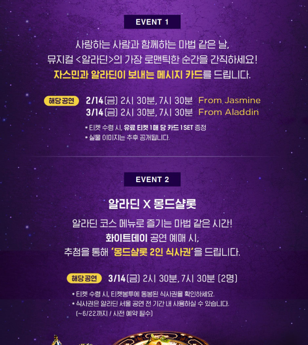 뮤지컬 알라딘의 6차 예매가 시작되었죠. 예매는 선착순으로 진행되니 서두르셔야 합니다! 일반 티켓 예매는 인터파크, 예스 24만 가능합니다. 아래의 버튼을 클릭하셔서 예매 사이트 링크 남겨두었습니다.