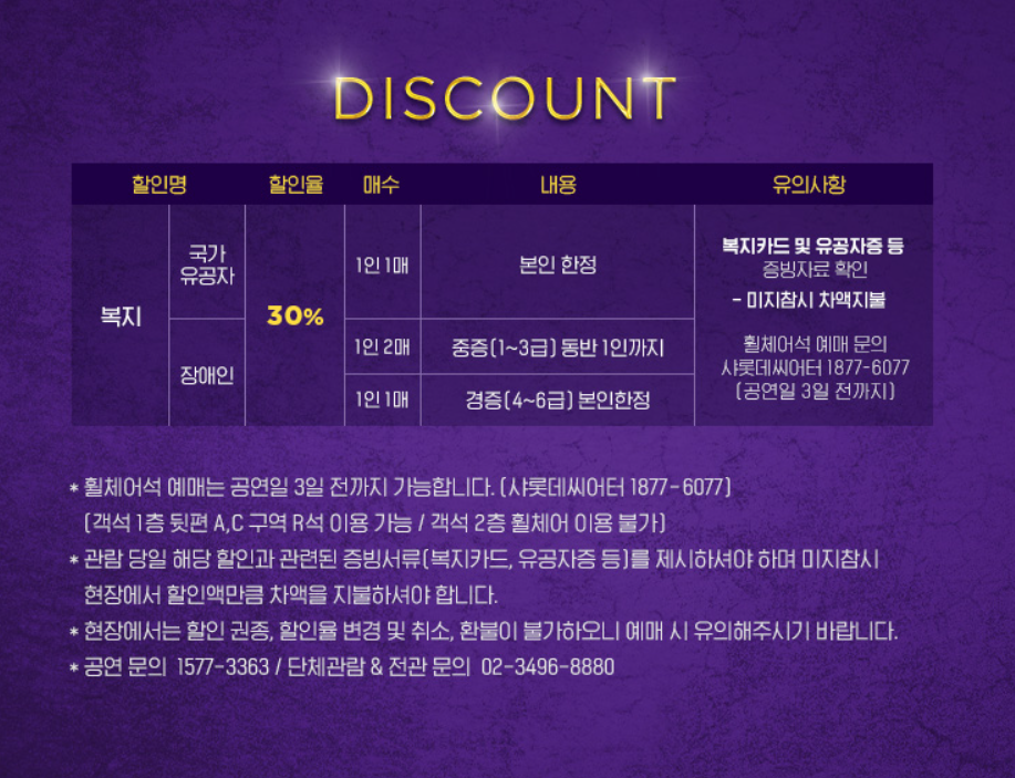 국가유공자는 본인 한정 1인 1매가 가능합니다. 장애인은 4-6등급 본인한정 1인 1매가 가능, 1-3등급은 동반 1인까지 총 1인 2매가 할인이 가능합니다. 현장에서는 할인 권종, 할인율 변경 및 취소, 환불이 불가능하니 예매할 때 좌석을 꼭 확인해주셔야 합니다.