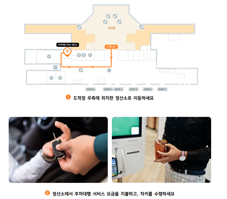 차량을 찾으실 때는 도착장 우측에 위치한 정산소로 이동해 주세요. 정산소에서 주자대행 서비스 요금을 지불하고, 차키를 수령하세요. (제휴카드의 경우 자동으로 무료 금액을 인식하여 영수증에 0원으로 출력 돼요.) 마지막으로 차량이 주차된 곳으로 이동해서 출차를 하시면 되는데요. 위에서 언급했다시피, 주차료와 주차대행 서비스 요금은 별도예요. 주차료는 정산소 옆 무인정산기를 활용하여 출차 전에 정산이 가능해요.