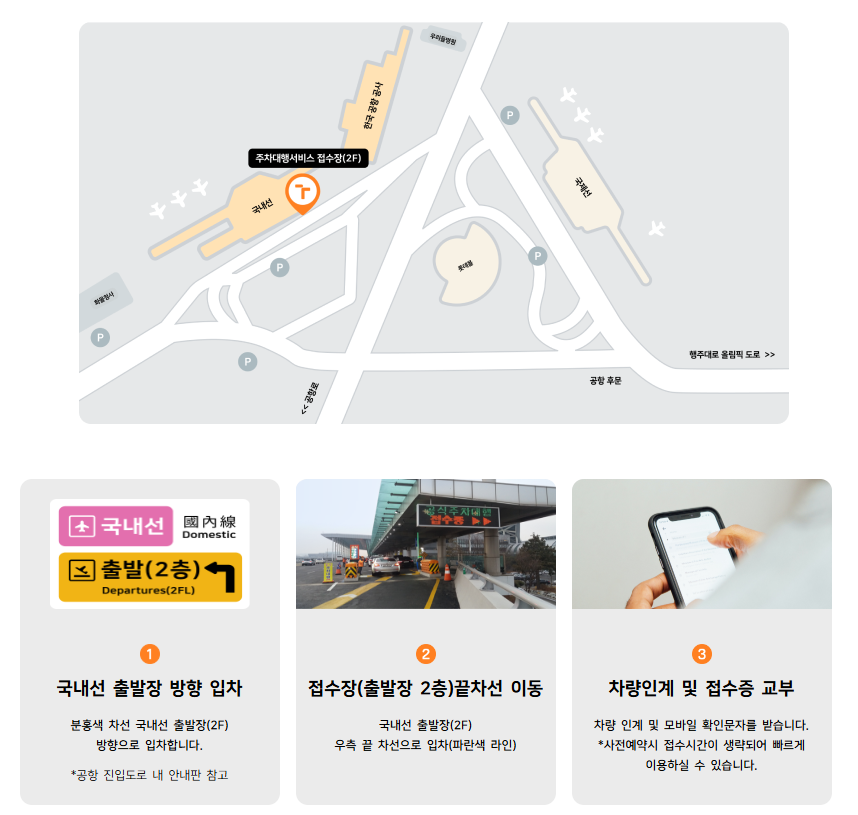 차량을 맡기는 방법을 알려드릴게요. 분홍색 차선 국내선 출발장(2F) 방향으로 입채해주세요. 그다음 국내선 출발장(2F) 우측 끝 차선으로 입차(파란색 라인)해주세요. 마지막으로 차량 인계 및 접수증 교부로, 모바일 확인문자를 받으면 되는데요. 사전예약을 하고 온 경우라면 접수시간이 생략되어 빠르게 이용이 가능해요. 그래서 사전예약을 추천해 드려요. 또한, 접수요원은 공식 주차대행이 표기된 '주황색 유니폼'을 입고 있다고 해요.